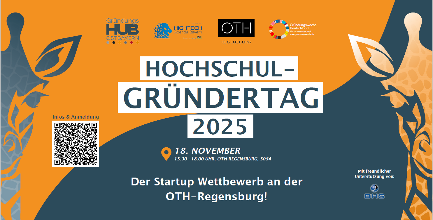 Das Verbundprojekt GründungsHUB Ostbayern lädt alle Neugierigen und Innovationsbegeisterten herzlich zum Hochschulgründertag am 18. November 2025 an der OTH Regensburg ein. Auch in diesem Jahr findet im Rahmen des Hochschulgründertages ein Pitch-Wettbewerb für Gründungsideen und Start-ups statt. Besonders freut es uns, dass wir mit dem GründungsHUB Ostbayern den Wettbewerb für Start-ups aus insgesamt sechs ostbayerischen Partnerhochschulen […]